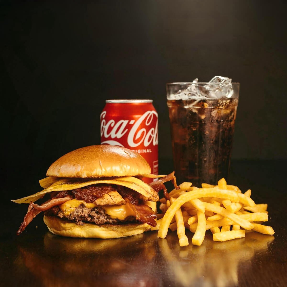 Delicious burger with crispy fries and a refreshing drink – the complete meal.